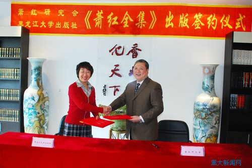 5月14日下午,《萧红全集》(新版)出版签约仪式在黑龙江大学出版社举行。黑龙江省作家协会副主席王立民、新版《萧红全集》的主要编撰者张海宁、黑龙江大学出版社社长、总编辑李小娟出席签约仪式。