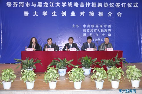 5月12日,黑龙江大学与绥芬河市战略合作框架协议签订仪式暨大学生创业对接推介会,在我校丽泽园3号教学楼地下报告厅隆重举行。出席本次签订仪式的有绥芬河市市长付延成、市委副书记赵会平、副市长吴庆兰,省教育厅学生处处长张明华,省就业指导中心副主任郭承哲,及我校党委副书记钟庆杰、曲科军,副校长何颖等。会议由曲科军副书记主持。