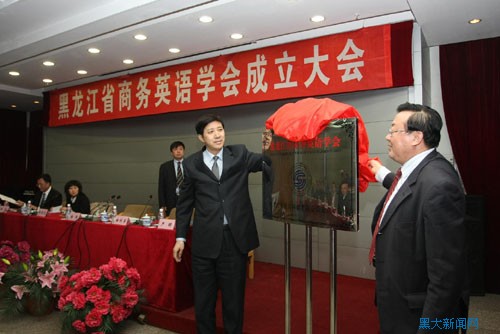 随后,省社科联副主席韩伟和我校党委副书记曲科军为黑龙江省商务英语学会揭牌。