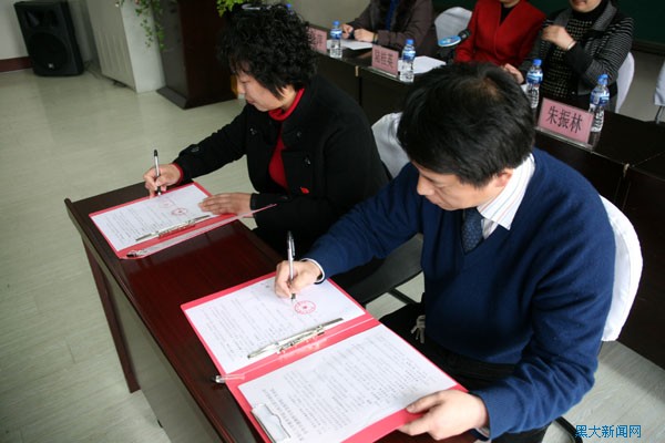 我校教育科学研究院院长朱振林与清滨小学校长刘艳华签署合作协议 摄影:李岩松