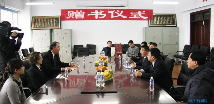 在捐赠仪式上,张政文校长代表黑龙江大学发表了热情洋溢的讲话,向美国驻沈阳领事馆此行前来的官员和工作人员表示欢迎和感谢。他说,改革开放以来,中美友好关系的不断发展惠及了中国知识界、教育界,这是有目共睹的事实。黑龙江大学与美国高校的交往基础深厚,源远流长。自1981年起,黑大先后接收了近百名美国留学生,共与15所美国大学建立了友好合作关系,派出30余名教师赴美访学。在中美双方共建积极合作全面的两国关系的大势推动下,近期黑龙江大学计划与美国南部高校联盟,共建在美规模最大的孔子学院。