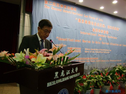由中国宪法学研究会、黑龙江大学法学院主办,日本一桥大学法学研究科亚洲研究教育基础项目协办的第二届亚洲宪法论坛暨“违宪审查制度在亚洲”国际学术会议于2009年8月21日至8月22日在我校国际文化交流中心隆重召开。参加会议的中外学者共80余人,其中来自日本、韩国、俄罗斯、越南、蒙古、印度等国家的学者40余人。