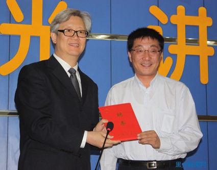 我校校长张政文向吴建中馆长颁发黑龙江大学客座教授聘书