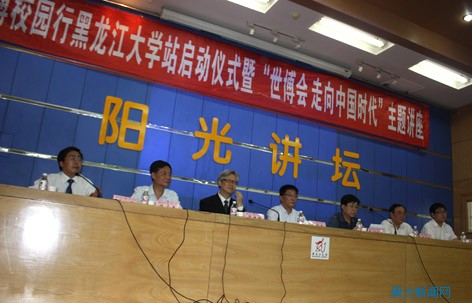 6月20日,由上海世博会执委会、黑龙江省世博办等部门主办的“世博校园行”活动,在我校阳光讲坛举行。上海图书馆馆长吴建中为首的负责上海世博会策划、管理的各位领导带着世博会“理解、沟通、团结、合作”的崭新理念和热情的召唤,来到黑龙江大学举行世博校园行黑大站的启动仪式。