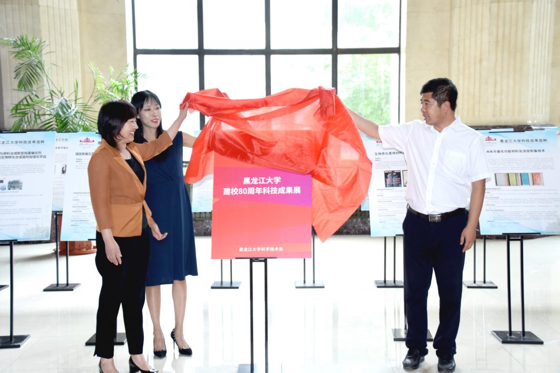 鹤岗市科技局局长尹波代表地方科技局致辞,省农业农村厅科教处处长樊丽娜为“黑龙江大学建校80周年优秀科技成果选粹”揭幕。