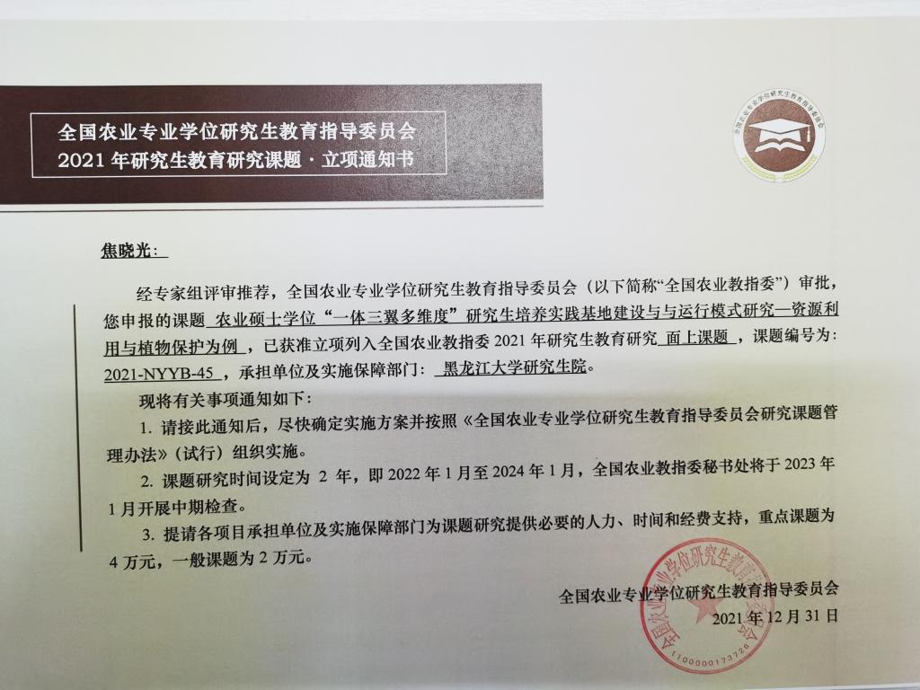 全国农业专业学位研究生教育指导委员会研究课题是为促进农业专业学位研究生教育的科学研究,推动模式机制创新和深化综合改革而设立的专业学位研究生培养改革项目,2021年度全国共立项75项,黑龙江省获批12项,我校获批3项,为省内唯一获批立项的非农林类高校。