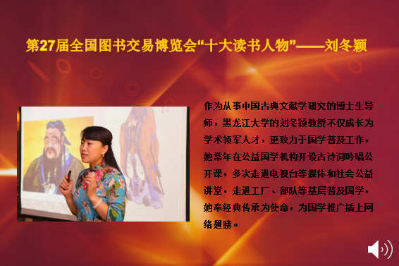 近日,第27届书博会“十大读书人物”评选结果在河北廊坊揭晓,我校刘冬颖教授因推广国学经典普及,公益传播诗词吟唱,入选2017年度中国“十大读书人物”。