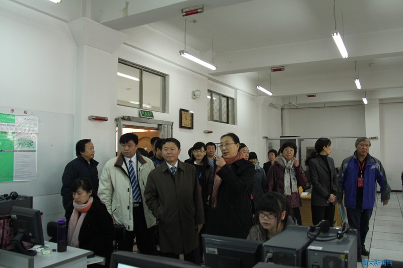 会后,专家组成员在何颖副校长的陪同下对我校相关教学机构及设施进行了实地考察。他们先后走访了应用外语学院的教学机构及设施,图书馆的外文中心、纯语言类阅览室、电子阅览室,实验楼语音室和四号教学楼的网络学习室,并在四号教学楼410室观看了大学交互英语学习和管理平台的演示。
