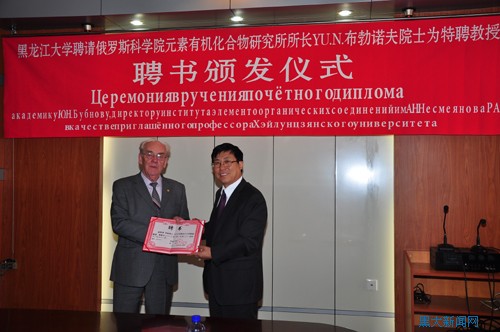 YU.N布勃诺夫院士表示非常荣幸能够成为黑龙江大学的特聘教授。他回忆了自己在大学期间与中国留学生交往时发生的趣事和结交下的深厚情谊,并希望通过努力,为促进黑龙江大学发展、深化中俄战略协作、增进两国人民友谊做出应有贡献。随后,他对俄罗斯科学院元素有机化合物研究所的标志性研究成果及其应用情况做了详细介绍,还同与会人员进行广泛、深入地交流。