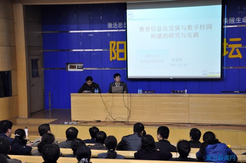 为推进我校信息化建设的进程、加快数字校园建设的步伐,11月2日上午10点,教育信息化与高校数字校园研究实践报告会在我校阳光讲坛举行。本次报告会由清华大学教育研究院博士生导师程建钢教授主讲,我校副校长何颖出席会议。教务处处长蒋鲲,教务处副处长张少杰、吴华洋,党委宣传部、统战部副部长杨其滨,现代教育技术中心副主任孙柏祥,信息与网络建设管理中心副主任王磊、李宁及各教学单位教学院长、系主任、教研室主任、实验室主任和2011年新留校教师一同参加了报告会。