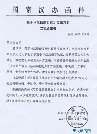 近日,经国家汉办、孔子学院总部评审,同意对俄汉语教材《汉语新起点》、《汉语新目标》改编项目立项。两套教材分别由我校与俄罗斯远东国立大学孔子学院、俄罗斯国立人文大学孔子学院合作组成编写队伍,俄罗斯远东国立大学孔子学院院长古丽洛娃和俄罗斯国立人文大学孔子学院院长易福成分任外方主编,我校张晓光教授为中方主编(项目副主编),出版单位为教育科学出版社。该改编项目的成功立项,不仅进一步巩固了我校在俄罗斯汉语教学界和国内对外汉语教学界的重要地位,也将为解决汉语教材影响汉语国际推广工作的瓶颈问题,及汉语在俄罗斯的进一步推广做出突出贡献。