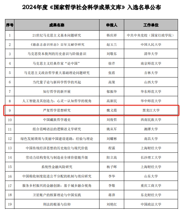 近日,2024 年度《国家哲学社会科学成果文库》入选名单正式公布。黑龙江大学哲学学院魏义霞教授申报的《严复哲学思想研究》成功入选,为本年度黑龙江省高校唯一入选成果。截至目前,黑龙江大学共5项成果入选《国家哲学社会科学成果文库》,占全省入选总数的5/6。