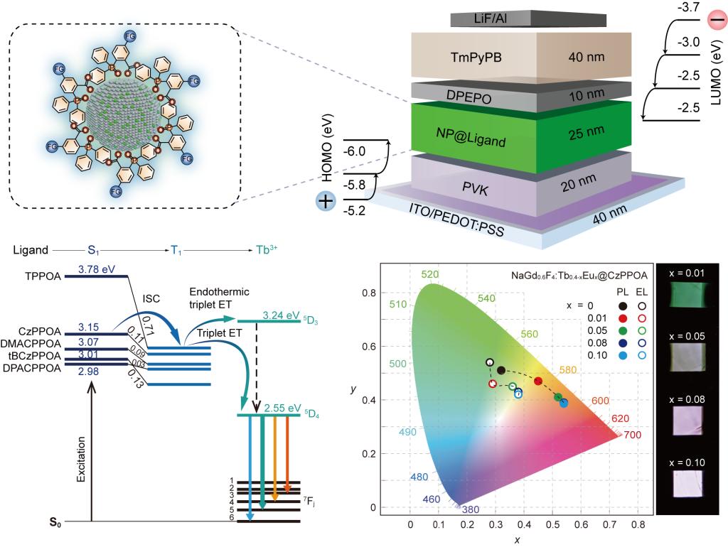 研究团队突破传统电荷注入思路的局限,设计合成了一系列芳基膦氧化物羧酸衍生物作为功能配体。该类配体通过羧基与纳米晶表面牢固结合,在电场作用下优先捕获电子与空穴形成激子,随后通过超快(<1 ns)且高效(系间窜越效率98.6%)的界面能量传递过程,将能量精准递送至纳米晶内部的镧系发光中心。其中,优化配体CzPPOA的三线态能量转移效率高达96.7%,有效规避了材料的绝缘特性,实现了光谱纯净、颜色可调的镧系离子特征发光。